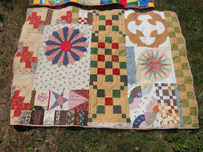 a few weeks ago, and was able to get another top together too. These quilts were made using up random blocks and leftover units I had laying around- mostly from other people, a few of my own. I had them as PIGS. You probably have a few PIGS of your own lurking around. (Projects In Grocery Sacks) I don't know what I was saving them all for...just waiting for the perfect little project to use each one in I guess. Well, I finally came to my senses and thought I will NEVER. EVER use these all up separately. I should just put them all together in one wild quilt. So that's what I did!!