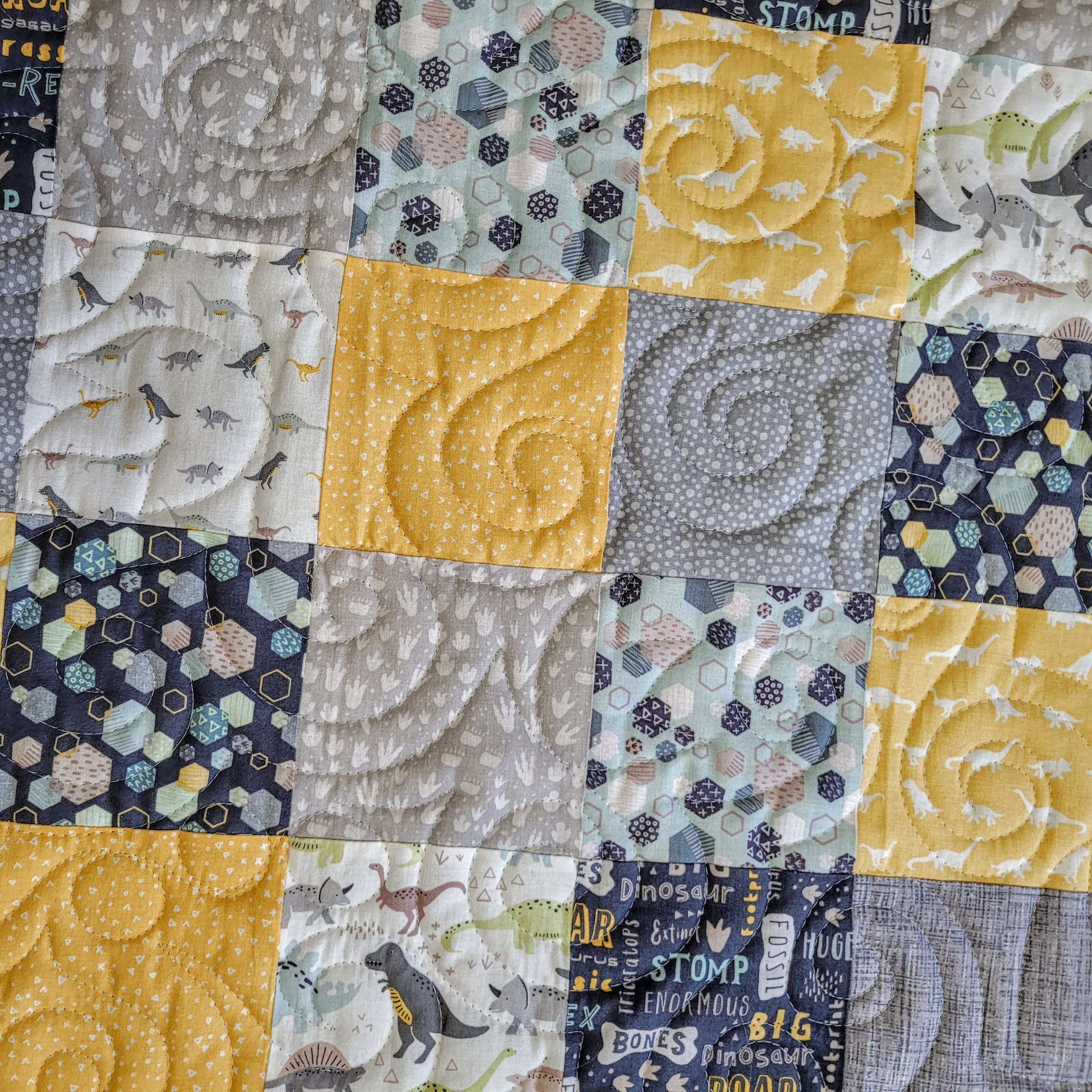 I alternated designs in the block between a large flower design, and overall frilly curls. Pebbles in the sashings and pointy feathers in the setting triangles.